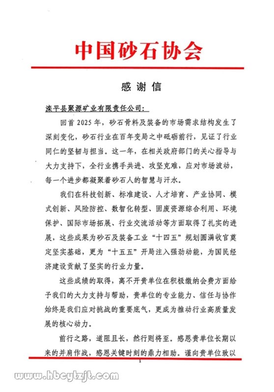 近日,河北創遠投資集團旗下灤平縣聚源礦業有限責任公司收到中國砂石協會發來的感謝信。信中對聚源礦業的專業能力、信任與協作表示高度認可,感謝聚源礦業長期以來的并肩作戰和關鍵時刻的鼎力相助。